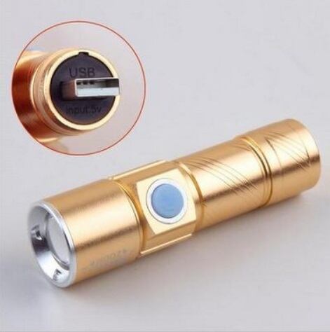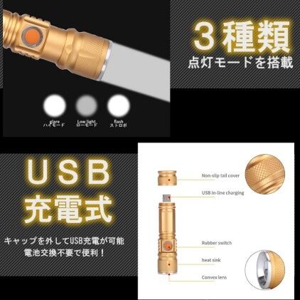 懐中電灯 led 強力 軍用USB充電式 防水 携帯 防災 ゴールド