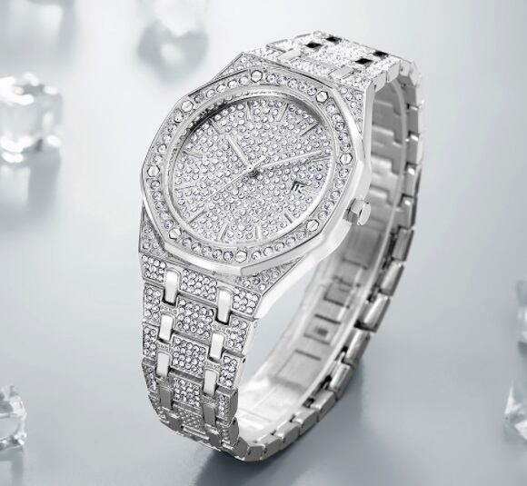 ベゼルケース、文字盤、ベルトに無数のCZダイヤ(キュービックジルコニア)を配置しています。