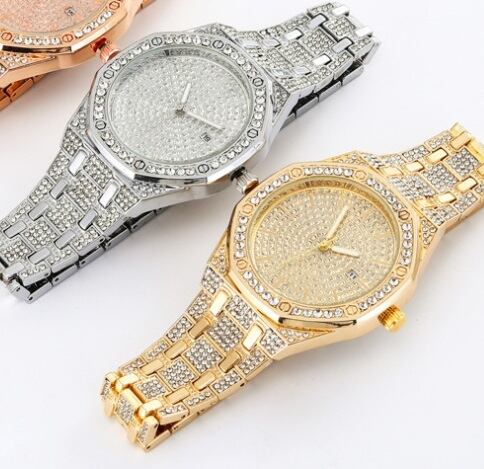 ベゼルケース、文字盤、ベルトに無数のCZダイヤ(キュービックジルコニア)を配置しています。