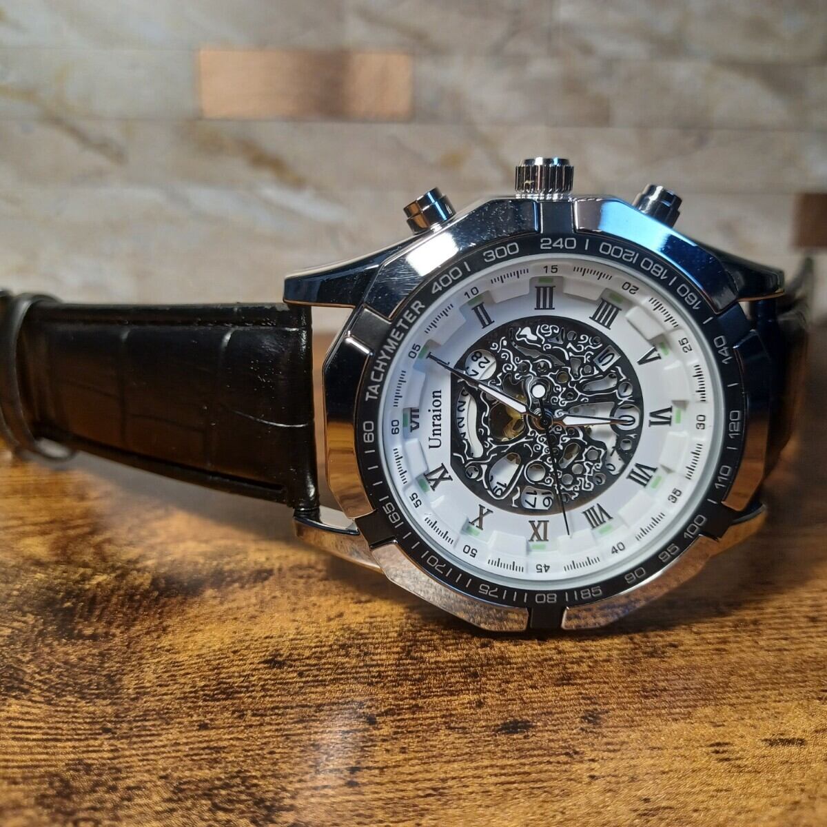 新品 彫スケルトンUnraion 腕時計メンズ レザー ラグジュアリーステンレス 白