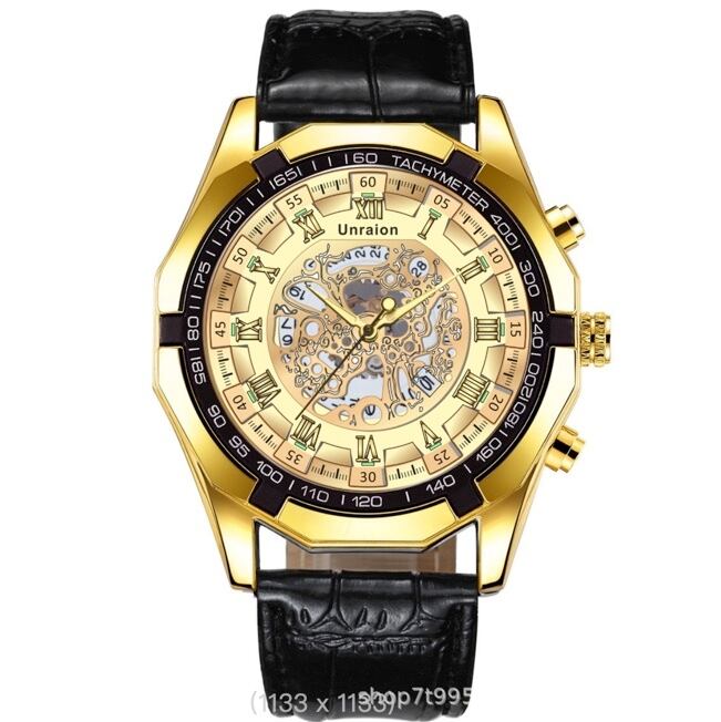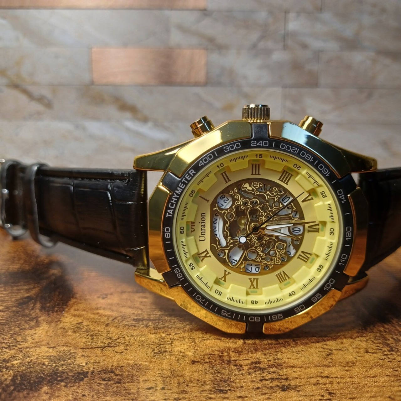 新品 彫スケルトンUnraion 腕時計メンズ レザー ラグジュアリーステンレス 金