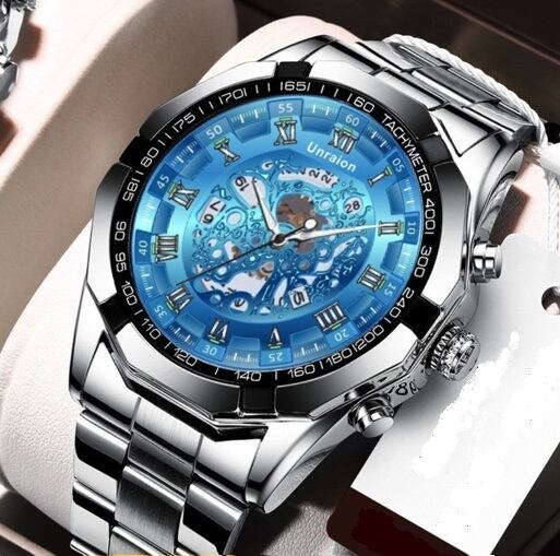 新品 彫スケルトンUnraion 腕時計メンズ ラグジュアリーステンレス 青