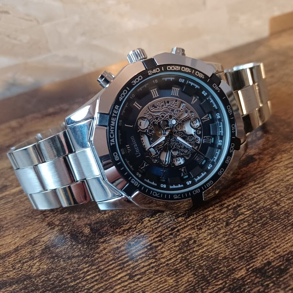Unraion スケルトン彫タイプの腕時計になります。