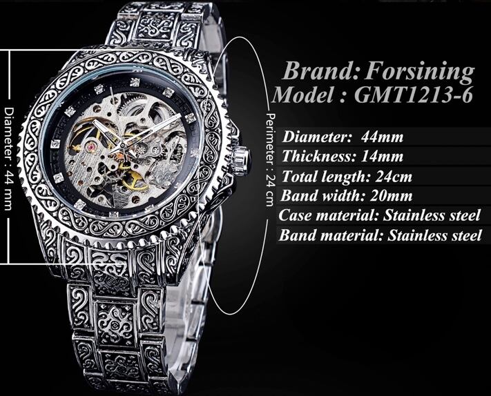 送料無料 3D 彫 自動巻き 機械式 メンズ フルスケルトン 腕時計 シルバー