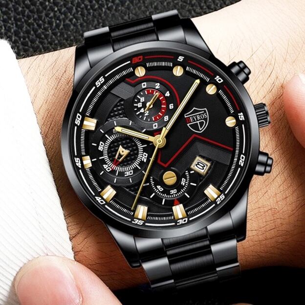 新品 クロノグラフ DEYROS 腕時計メンズ ラグジュアリーステンレス 黒金