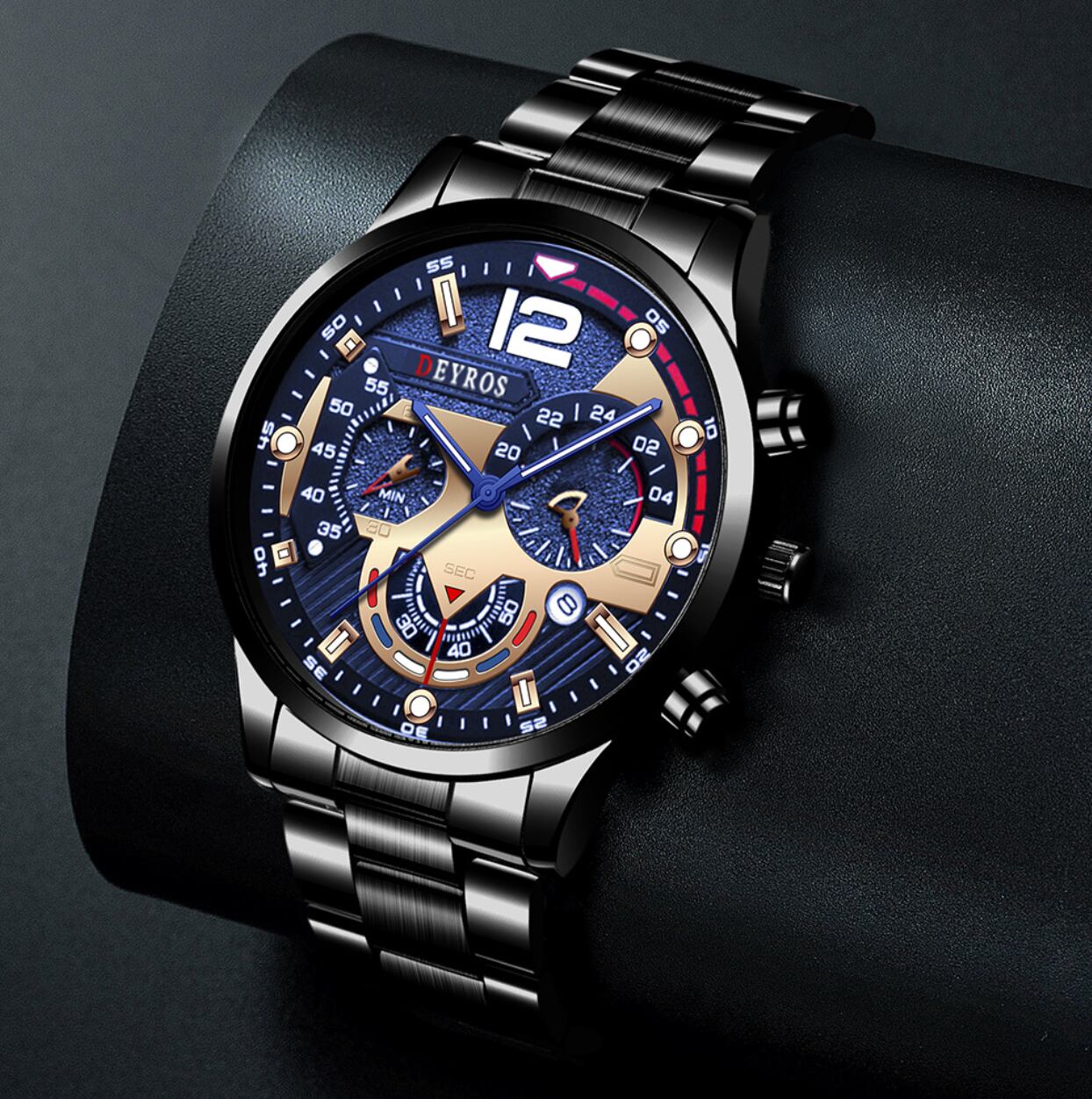 新品 DEYROS クロノグラフ 腕時計メンズ ラグジュアリーステンレス 黒/青