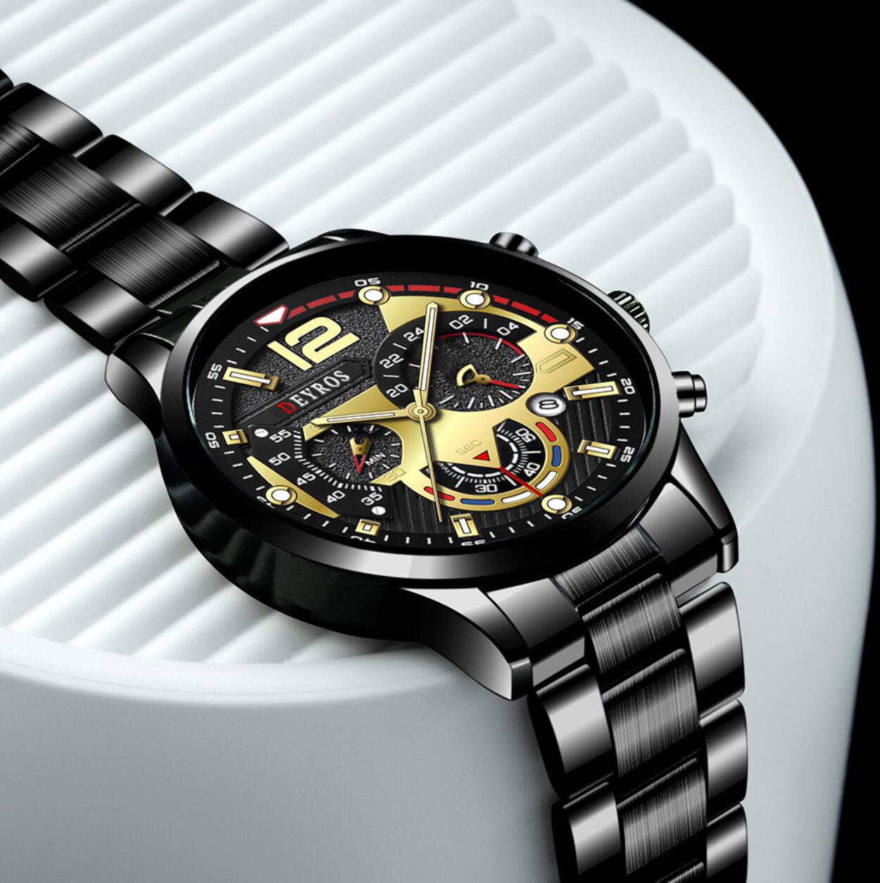 新品 DEYROS クロノグラフ 腕時計メンズ ラグジュアリーステンレス 黒/金