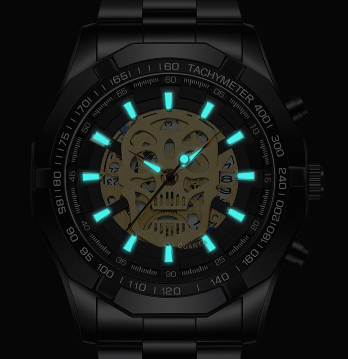 BINBOND ラグジュアリー スカル スケルトン ステンレス 腕時計 シルバー黒